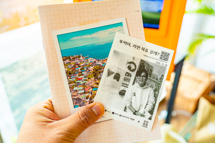 포토투어는 스탬프 북을 들고 지정된 장소를 찾아가며 사진을 모으는 방식. 묵호역 인근 '바나나스테이션'과 독립 서점 '잔잔하게'에서 스탬프 북을 찾아 든 순간, 여행은 본격적으로 시작된다. 주황색 카메라를 이용해 기념 사진을 남기면, 출력된 사진을 스탬프 북에 붙이는 소소한 재미가 쌓인다.