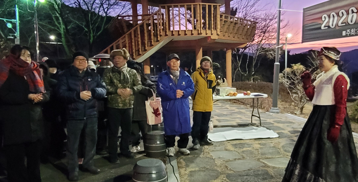 혹한의 날씨에도 한복 차림으로 나서 우렁차게 낭송하니 모두의 염원이 한데 모여 노성산 정상으로, 천상으로 전달하는 듯했다. 마이크 소리는 그 정도였다. 영하 15도 혹한의 날씨에 장비도 얼어붙어선지, 이후 덕담 시간에는 단절음만 내보냈다. 새해덕담은 조관행 어르신분회장에 이어 도의원과 시의원, 면장, 정재근 한유진 원장, 허용실 노성농협조합장, 윤여두 ㈜루트회장 순으로 이어졌다. 이수행 번영회장이 만세삼창으로 대미를 장식하자 언능 끝나기를 기다리기라도 했다는 듯 두레풍물소리가 받았다.