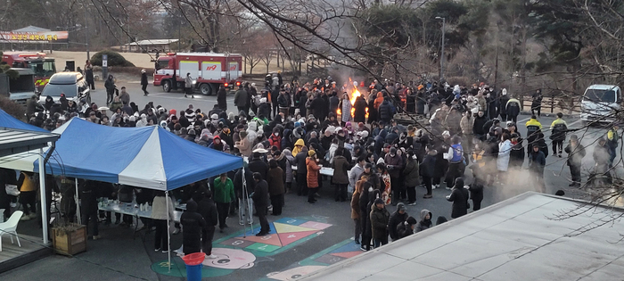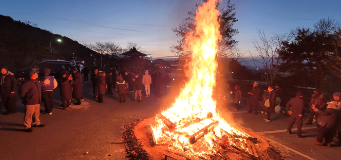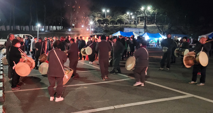 차가 명재고택쪽으로 좀 진입했나 싶었는데 벌써 방범대원들 손에는 경광봉이 들려 있다. 노성산 출발지인 애향공원까지 700m 어둑한 길을 걸어갔다. 목적지가 분명하니 묵묵 걸어갔는데, 가자마자 찾은 곳은 큰 모닥불(庭火). 이중삼중 둥그런 인간사슬띠 파고들기 만만찮았지만, 빈틈은 생겨났다. 언 몸 한참 녹인 후 둘러보니 좌측으로는 텐트에서 수증기가 피어오르고, 오른쪽 모정 부근에는 현수막이 걸려 있다. <2026 병오년 노성산 해맞이 행사> 행사장쪽에서 외치는 소리 하나 “이제 두드려 봐야지!” 노성면 두레풍장 전승보존회가 움직이기 시작했다. 징소리~ 북소리~ 잠들어 있는 해를 깨우고 일으켜 세우려는 태고적 자명종 소리로 들렸다.