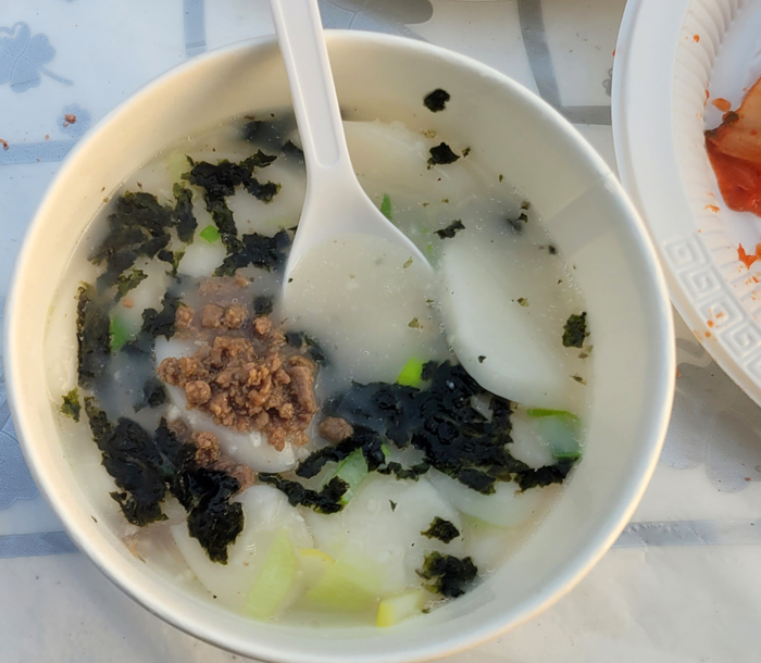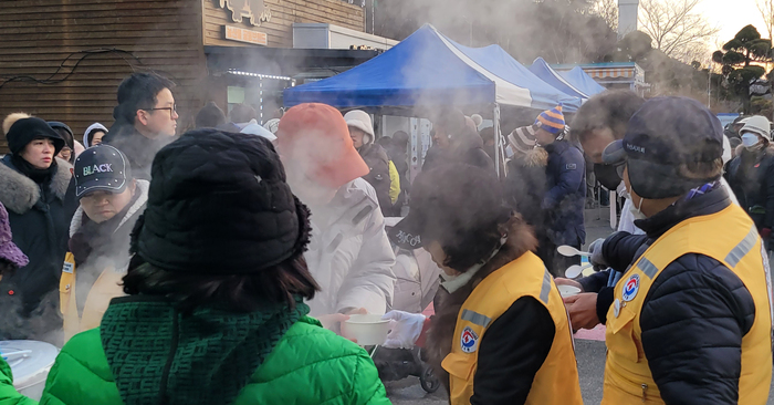 식이 끝나자 발길은 떡국 솥단지로 향하였다. 노상 탁자 위에는 김 모락 떡국에 김치, 시루떡, 돼지고기에 귤까지 깔려있다. “고기는 얼어서 잘 안 떨어지네그려!” 그래서 더 빛나는 떡국이다. 장사진 속에는 동·서양 외국인들도 간간 눈에 띈다. 학교 다니는 학생들은 물론 엄마아빠 손잡은 고사리손들도 있었다. “깨우지 않았는데도 일어나서 왔어요.” 모자 안 쓰거나 귀덮개 안 한 사람이 거의 없다. 함께 따라나온 개들도 머리까지 중무장인데, 나만 범 무서운 하룻강아지처럼 투구가 없다. 민낯이 좋은 점도 있다. 알아봐주는 사람들이 있어서다. 어둑어둑 실루엣에서 모자에 마스크까지 중세기사들이다 보니 아는 사람도 그냥 지나치기 일쑤.
