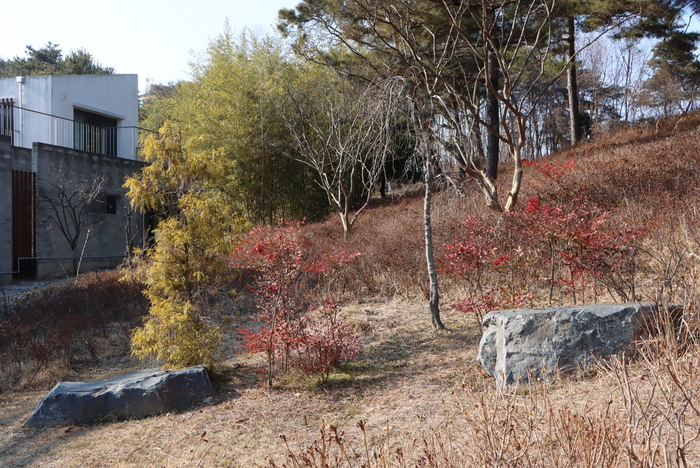 지난 봄, 이 돌의자 앞으로 무궁화 7그루가 식재되었다. 국내 최대의 무궁화농장인 ‘장호농장(대표 전병열)’에서 기증한 무궁화 삼천리와 광명이다. 상대적으로 꽃이 귀한 여름, 이 무궁화는 영산홍에 이어 붉은꽃 등불을 밝혀주었다. 좀더 아래 내려오면 넉넉하게 감싸주는 나무가 둘 있다. 둘다 키높이 반송인데, 하나는 조경석 바로 뒤에서 커다란 일산(日傘)을 펼쳐들고 있다.
