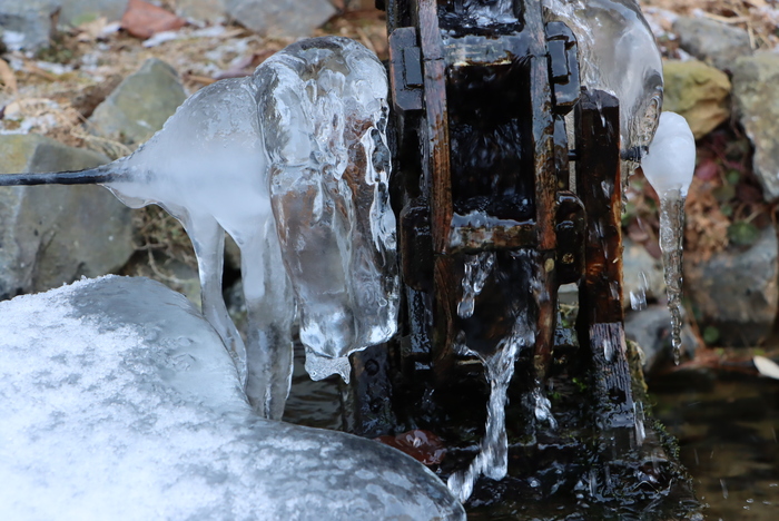 ▲ 겨울이면 고드롬 쇼 연출하는 문학관 뒤란의 연못 물레방아 ©