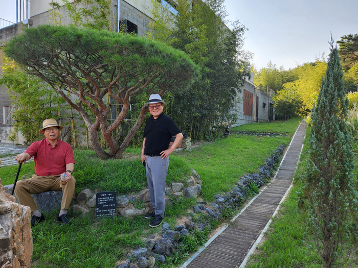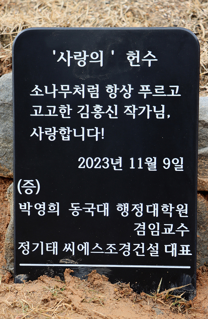 우측 소나무는 2023년 박영희 동국대 교수와 정기태 조경건설 대표가 문학관에 기증한 반송이다. 그 밑에는 편하게 걸터 앉을 수 있는 너럭바위이다. 임금 행차때 썼던 홍양산이나 의장(儀仗) 부럽잖은 그늘밑 포토존이다. 이 나무 밑에서 박영희 교수는 김홍신 작가와 이어온 인연의 시간들을 풀어놓는다. 그 실타래를 직접화법으로 들어본다.
